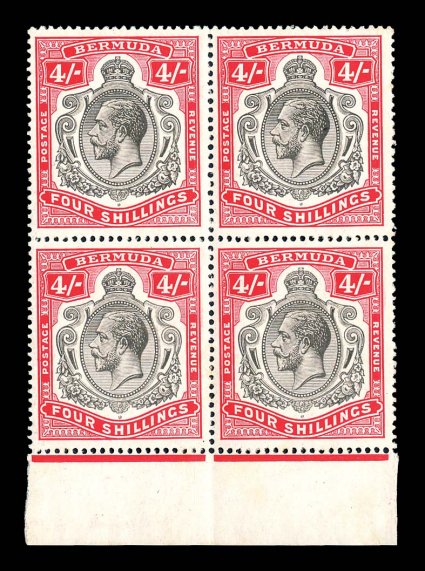2399 nhbl S.G. #52b, 52be imageS.G. #52be, 1920 4/- Black and carmine, break in lines below left scroll, variety is found in the top right stamp of a mint bottom sheet-margin block of four, positions 44-45/56-57, attractive with strong bright colors, o.g., trace of gum toning though never hinged, light vertical fold between stamps, otherwise very fine (Scott #51, 51 var.). (Image) for hinged £480+