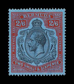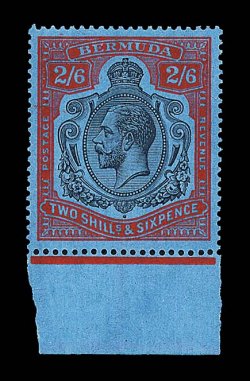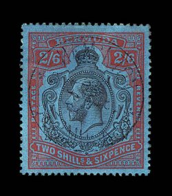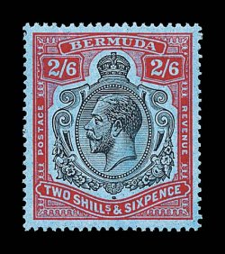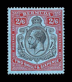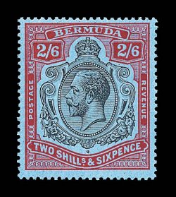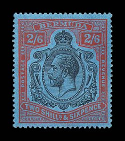 2430 og S.G. #89gf imageS.G. #89gf, 1929 2/6 Black and red on blue, damaged leaf at bottom right, position 53, exceptionally well centered example, radiant color and quite deep blue paper, o.g., extremely fine (Scott #95 var.). (Image) £325
