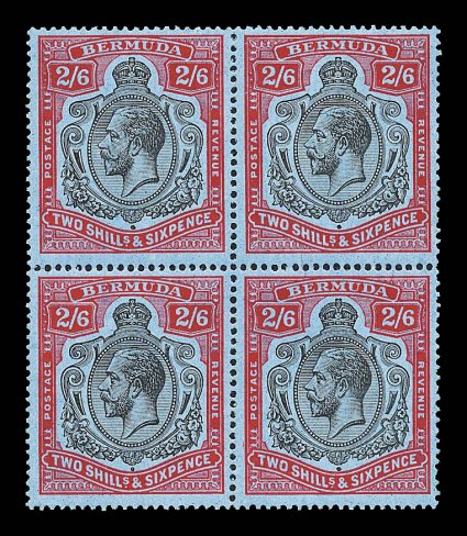 2429 nhbl S.G. #89, 89e imageS.G. #89e, 1927 2/6 Black and carmine on pale blue, break in lines below left scroll, scarce variety being the bottom right stamp in a pristine block of four, positions 32-33/44-45, excellent colors and impressions, o.g., n.h., very fine (Scott #95, 95 var.). (Image) for hinged £490+