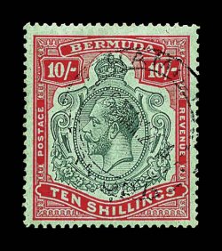 2439 O S.G. #92 var. imageS.G. #92 var., 1924 10/- Dark green and red on pale emerald, an especially attractive used shade variety of this value, having the light colored paper of the early printing, but the red fluorescing under ultraviolet light like the 1930 printing, and green of the vignette much darker than either usually come, Hamilton c.d.s. of 16 May 1928, well centered and choice very fine; a scarce stamp used, particularly in these rich colors (Scott #96 var.). (Image) Est. 200-300