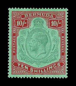 2440 og S.G. #92ga imageS.G. #92ga, 1924 10/- Green and red on deep emerald, break in scroll, position 12, well centered mint example of this variety with intense red color and attractive and unusual pastel emerald vignette that blends with the strong emerald paper, o.g., very fine and choice (Scott #96a var.). (Image) £600