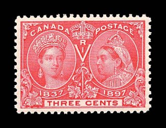 2581 nh 53 image#53, 1897 3c Jubilee, flawlessly centered within large and perfectly balanced margins, brilliant color, pristine o.g., n.h., extremely fine (Unitrade C$75.00). (Image) $30.00