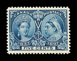 2582 nh 54 image#54, 1897 5c Jubilee, extraordinarily well centered within very large margins, rich luxuriant color and a razor-sharp impression on fresh white paper, o.g., n.h., extremely fine and most attractive (Unitrade C$180.00). (Image) $95.00