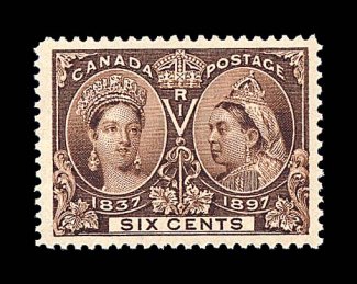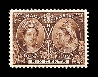 2583 nh 55 image#55, 1897 6c Jubilee, a phenomenal mint example of this scarcer value, in a condition that is almost unheard of on the Jubilee issues, sporting absolutely enormous margins and being incredibly well centered within them, additionally this marvelous stamp possesses incredibly deep and luxuriant color, with a razor-sharp impression on brilliantly fresh paper, pristine o.g., never hinged, a superb gem for the most demanding quality conscious collector; 1999 PF certificate (Unitrade C$900.00). (Image) $450.00