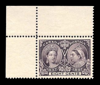 2585 nh 56 image#56, 1897 8c Jubilee, a stunning top left corner sheet-margin single that is absolutely perfectly centered within remarkably large margins, lovely rich color and a highly detailed impression, o.g., never hinged, extremely fine; a stamp with tremendous eye appeal; 2003 PF certificate (Unitrade C$225.00). (Image) $105.00