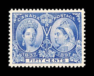 2590 nh 60 image#60, 1897 50c Jubilee, an outstanding mint single in a quality that is rarely encountered on any Jubilee stamp, as this stamp possesses exceptionally large margins and is remarkably well centered within them, plus its color is especially rich and its paper unusually crisp and white, clean o.g., n.h., extremely fine; a truly rare stamp in this superb condition; 2001 PF certificate for a block of four, this being the bottom right stamp (Unitrade C$975.00). (Image) $550.00