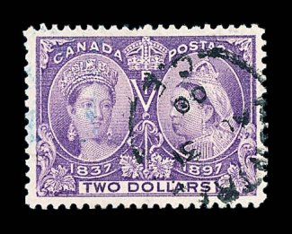 2591 O 62 image#62, 1897 $2.00 Jubilee, used, excellent centering within large margins, strong color, c.d.s. postmark and light blue cancel at left, tiny split perforation at top, otherwise extremely fine; 2002 Sismondo certificate (Unitrade C$1,125.00). (Image) $500.00