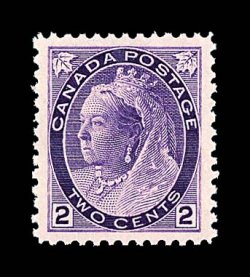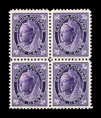 2592 nhbl 68 image#68, 1897 2c Purple "Maple Leaf", choice quality mint block of four, each stamp being remarkably well centered and margined, deep intense color and impression, o.g, n.h., extremely fine (Unitrade C$360.00+). (Image) $150.00+