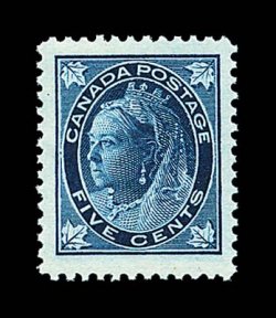 2593 nh 70 image#70, 1897 5c Dark blue on bluish "Maple Leaf", a remarkable jumbo mint single, possessing huge margins all around and being exceptionally well centered within these lavish borders, deep prooflike color and impression on fresh white paper, o.g., never hinged, extremely fine; a striking gem; 2003 PF certificate (Unitrade C$450.00). (Image) $240.00