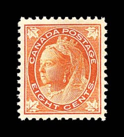 2595 nh 72 image#72, 1897 8c Orange "Maple Leaf", a flawless gem mint single, possessing mathematically precise centering amid very large margins, gorgeous deep color that radiates off the immaculately white paper, unusually even and intact perforations, pristine o.g., never hinged, and extremely fine gem for the perfectionist (Unitrade C$900.00). (Image) $450.00