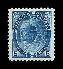2600 nh 79 image#79, 1899 5c Blue on bluish "Numeral", a highly desirable mint example, being exceedingly well centered amid lavishly large margins, rich luxuriant color, pristine o.g., never hinged, extremely fine (Unitrade C$750.00). (Image) $325.00