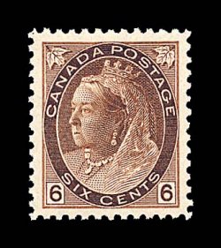 2601 nh 80 image#80, 1898 6c Brown "Numeral", marvelously well centered amid large and exceptionally well balanced margins, lovely rich color, immaculate o.g., never hinged, extremely fine gem; an especially choice example; 1986 Greene Foundation certificate for a block of four, this being the bottom right stamp (Unitrade C$450.00). (Image) $240.00