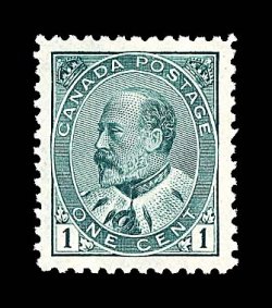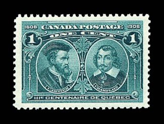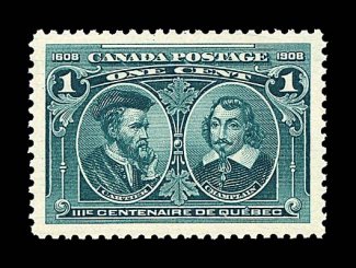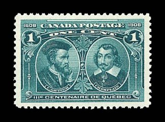 2616 nh 97 var. image#97 var., 1908 1c Quebec Tercentenary, hairlines in the margin, perfectly centered within huge margins, sumptuously rich color, pristine o.g., n.h., extremely fine; a truly gem example (Unitrade #97i). (Image) Unitrade C$105.00