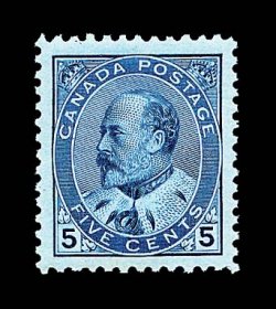 2607 nh 91 image#91, 1903 5c Blue on bluish, a remarkable quality mint single, flawlessly centered within lavishly large and perfectly balanced margins, exceedingly fresh and crisp, o.g., never hinged, extremely fine; an especially scarce and desirable stamp in this premium condition; 2001 Greene Foundation certificate (Unitrade C$750.00). (Image) $250.00