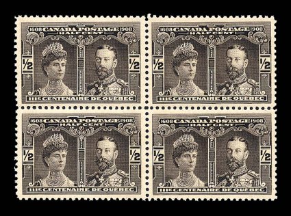 2613 nhbl 96 var. image#96 var., 1908 1/2c Tercentenary, major re-entry, position 44, showing the line through "CANADA", the variety being the top right stamp in a block of four, exceptionally well centered and margined, strong color, o.g., n.h., extremely fine; a handsome showpiece (Unitrade #96i; C$270.00). (Image) $86.50+