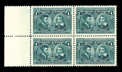 2617 nhbl 97 var. image#97 var., 1908 1c Quebec Tercentenary, hairlines in the margin, left sheet-margin block of four, with the hairlines quite prominent in the margin, remarkably well centered, deep rich color and impression, o.g., n.h., extremely fine; an outstanding quality block that shows the variety especially well (Unitrade #97i). (Image) Unitrade C$420.00