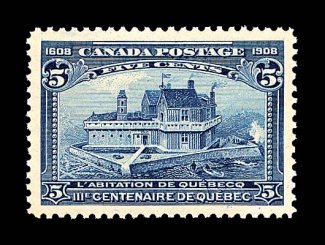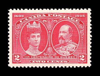 2619 nh 99 image#99, 1908 5c Quebec Tercentenary, impeccably well centered within uncharacteristically large margins, strong rich color, o.g., n.h., an extremely fine gem (Unitrade C$225.00). (Image) $100.00