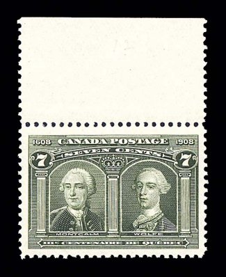 2620 nh 100 image#100, 1908 7c Quebec Tercentenary, an especially handsome top sheet-margin single, being extraordinarily well centered amid extra-large margins, plus its color is strong and rich, while its impression is razor sharp on fresh white paper, o.g., never hinged, extremely fine (Unitrade C$600.00). (Image) $275.00