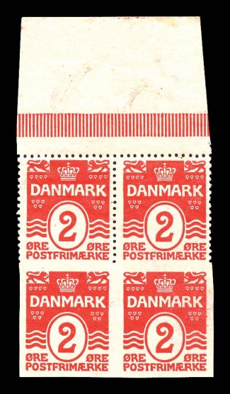2641 nhbl 86a var. image#86a var, 1913 2o Carmine, imperforate, in combination top sheet-margin block of four, the bottom pair being completely imperforate and top pair showing one placement of the comb perforator perforating it at top and vertically, o.g., n.h., very fine and choice; this value is listed imperforate, but unlisted as perforation error in a combination perforated/imperforate multiple, very scarce thus (Facit #87v var.). (Image) Est. 300-400