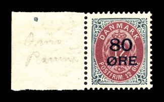 2643 nh 136a image#136a, 1915 "80 ORE" Surcharge on 12o Slate and dull lake, Inverted Frame, left sheet-margin single, position 51, the only inverted frame position, fresh and very well centered stamp, o.g., hinged in the selvage only, stamp n.h., extremely fine (Facit #49v). (Image) $400.00