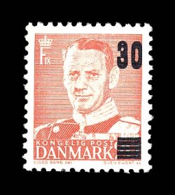 2644 nh 357b image#357b, 1955 "30" surcharge on 20o Dark red, double surcharge, two clear and equally strong impressions of the surcharge closely aligned and showing the double set of bars at bottom as well, o.g., n.h., signed in pencil on the reverse, extremely fine (Facit #385v2). (Image) $400.00