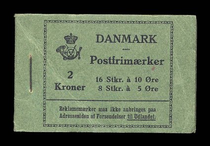 2645 BK Facit #HRE6 imageFacit #HRE6, 1929 2K Rundskuedagen advertising booklet, complete and unexploded containing four panes of four of 10o Green with two advertising labels on each pane, and two panes of four of the very scarce 5o Brown with two labels on each pane, panes are all fresh and well centered, o.g., n.h, very fine-extremely fine, the front cover has a couple of light creases, but still a very fine complete example of this rare booklet. (Image) Est. 400-500