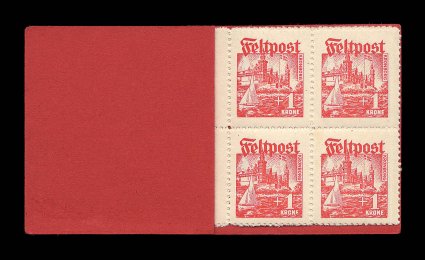 2646 BK Michel #I-III imageMichel #I-III, 1944 Danish Legion complete booklet, private issue during the German occupation of Denmark, booklet with red cover and containing a pane of four of each of the three values, front cover folded back along issued fold ridge for that purpose and minor bends to the back cover, panes are fresh, o.g., n.h., very fine and scarce, particularly in a complete booklet. (Image) Euro €4,500