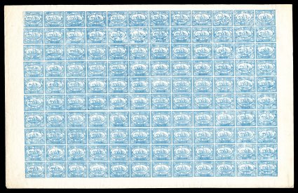 2648 nhbl S.G. #3 imageS.G. #3, 1868 20c Blue, full sheet of 120, remarkably fresh for a sheet of this vintage, with rich bright colors on clean white paper, o.g., n.h., very fine; an important showpiece for the specialist of this issue as very few sheets of any of the values still remain intact today. (Image) S.G. £9,000+