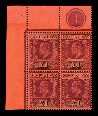 2650 nhbl 78 image#78, 1912 £1 Violet and black on red King Edward VII, top left corner plate no. 1 block of four, intense colors, o.g., never hinged, very fine; a very scarce and most impressive positional block of this high value (S.G. #124; for hinged £1,200+). (Image) for hinged $1,300.00+