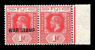 2652 og MR2b image#MR2b, 1915 1p Scarlet, horizontal pair with and without "War Stamp" overprint, fresh example with right sheet margin as usual, o.g., light h.r. reinforcing the perforations which are intact, very fine; this error occurred when one sheet of 120 was printed with the overprint shifted exactly one stamp to the left producing this error in the right two columns, and putting one column of overprints in the selvage at left, thus only ten examples of this error were originally printed, of these the top gutter strip of twelve is in the Royal Collection, three other strips and four pairs, including this one, are recorded of the remaining nine possible; a desirable and first class rarity of both Fiji and British war tax stamps; 1980 BPA certificate (S.G. #139ab; £5,500). (Image) $10,000.00