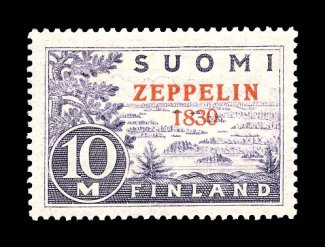 2653 nh C1a image#C1a, 1930 "Zeppelin/1830" overprint on 10M Gray lilac, "1830" for "1930" error, a pristine mint single of this rare and popular error, very well centered and possessing attractive bright colors, o.g., n.h., extremely fine; a total of only 500 examples were originally printed, less are available today and far less are available in this stellar never hinged condition; 1995 Gummesson certificate (Facit #165). (Image) for hinged $2,000.00+