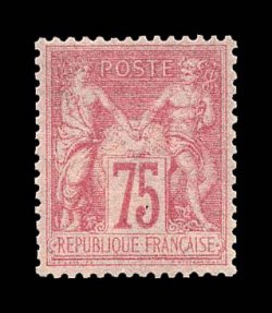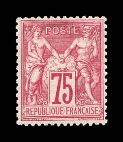 2657 og 83 image#83, 1877 75c Carmine on rose, Ty.II, a remarkably well centered and attractive mint example of a this particularly scarce value, pretty pastel color on bright paper, surrounded by full even perforations, unusually fresh full o.g. with just the barest trace of hinging, extremely fine; an especially difficult and desirable stamp especially in this gem quality; signed A. Brun and Calves, and accompanied by 1996 Roumet certificate (Yvert #81; €2,450). (Image) $1,500.00