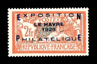 2658 nh 246 image#246, 1929 2fr Le Havre ovpt., wonderfully bright and fresh, excellent centering, pristine o.g., never hinged, extremely fine; a most impressive mint example of this scarce and often faked stamp; signed Calves and accompanied by a 2001 PF certificate (Yvert #257A; E1,150). (Image) $675.00