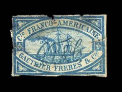 2660 O image1856 "Gauthier Freres et Cie" blue private ship letter stamp, used, with "G.F. & Co." manuscript cancel, four clear to full margins, stamp has several defects of little importance considering its enormous rarity; this stamp was issued in 1856 both in red and blue for use on mail carried privately by the Gauthier Freres steamship company from Havre, France to New York or Rio de Janeiro, both colored stamps are very rare, as only seven copies of the red stamp are recorded, however this is one of only two blue stamps known, the other being on a cover front; according to S. Ringstrom and H.E. Tester in their authoritative work The Private Ship Letter Stamps of the World - Part 2 they described the Gauthier Freres stamps as being "among the rarest in the world"; 2003 PF certificate. (Image) Est. 1,500-2,000