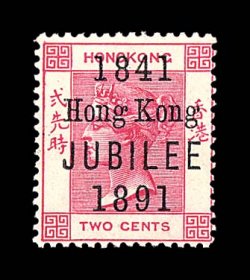 2697 og 66 var. image#66 var., 1891 2c Rose with "1841/Hong Kong/JUBILEE/1891" overprint, broken "1" in "1891", uncommonly well centered, deep color and impression, o.g., a very fine example of this scarce variety (S.G. #51c). (Image) S.G. £850