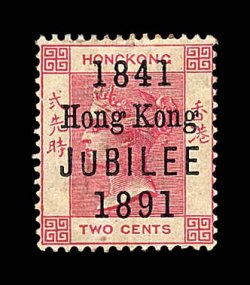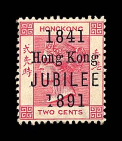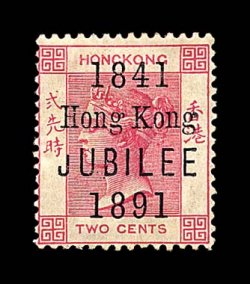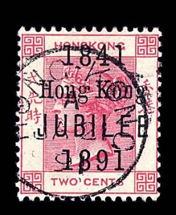 2696 O 66 image#66, 1891 2c Rose, with "1841/Hong Kong/JUBILEE/1941" overprint, uncharacteristically well centered, brilliantly fresh, cancelled by a nearly complete January 21, 1891c.d.s. of the Hong Kong post office, trivial light crease, still very fine and attractive; while many used examples bear the January 22 first day postmark, only a tiny number of stamps (apparently all from one block) were cancelled by favor on January 21; clear 2004 RPS certificate (S.G. #51). (Image) Est. 1,500-2,000
