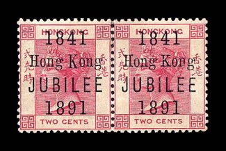 2700 og 66d image#66d, 1891 2c Rose with "1841/Hong Kong/JUBILEE/1891" overprint, tall "K" in "Kong", in horizontal pair with the normal overprint, the variety being the left stamp, deeply rich color, well centered, o.g., a few separated perfs in the middle have been sensibly reinforced, trivial gum bend at top left, very fine; a scarce variety that is particularly desirable in this se-tenant format (S.G. #51d; £1,650+). (Image) $1,650.00+