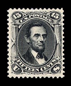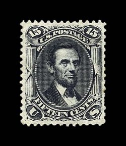 1161 og 108 image#108, 15c Black re-issue, a remarkably fresh example of this especially difficult value, with intensely rich color and a razor-sharp impression on clean white paper, uniformly intact perforations all around, well centered, full o.g., lightly hinged, choice very fine; only 397 issued; 2001 PF and PSE certificates. (Image) $4,750.00