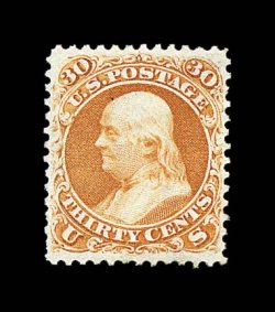 1164 ng 110 image#110, 30c Brownish orange re-issue, an incredibly well centered unused example of this value which is well known for usually being found with very tight margins and often off center, this particular copy boasts near perfect centering within uncharacteristically large margins, additionally its color is especially deep and luxuriant which contrasts well with its bright white paper, traces of o.g., extremely fine; a particularly rare stamp this well centered and margined; only 346 issued; 1990 PF certificate. (Image) $3,500.00