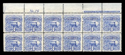 1175 ogPB 114 image#114, 3c Ultramarine, a pristine full top margin imprint, half arrow and plate "No. 26" block of twelve, wonderfully bright and fresh, with deep rich color and prooflike impression, strong and intact perforations, quite well centered, particularly for a classic 19th century plate block, full clean o.g. which shows interesting split grill impressions well, lightly hinged on three stamps only, rest n.h., tiny internal tear in the grill of position 2, so unobtrusive that it is hard to find, still very fine and choice; one of the finest quality Three Cent 1869 Pictorial plate blocks to come on the market in quite some time; Chapin census #330; clear 1988 PF certificate and 2003 PF certificate. (Image) $7,650.00+