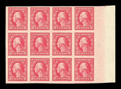 184 nhbl 485 image#485, 5c Carmine imperforate single error in a pristine right sheet-margin block of twelve (4 x 3), large to huge margins all around, brilliantly fresh, lovely rich color, immaculate o.g., never hinged, extremely fine; it has been recorded by George B. Sloane that a total of 48 uncut imperforate sheets of 400 of plate no. 7942 were sold out of the New York Post Office, each sheet containing a single error and a double error, making 48 the maximum number of either error block and certainly less than that are available today; a marvelously choice example of this important and highly desirable error rarity. (Image) $32,500.00