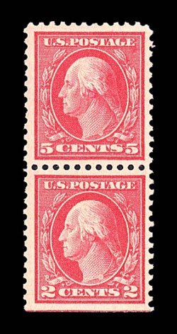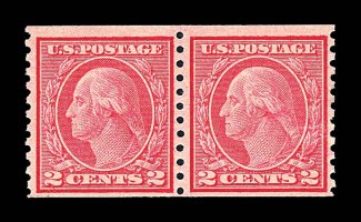 186 og 491 image#491, 2c Carmine coil, Ty. II, perf. 10 vert., a desirable mint pair of this rare and sought-after rotary coil, marvelously fresh, with rich distinctive color, considerably better centered than the majority of pairs one sees, full clean o.g., lightly hinged, choice very fine; any #491 pair is rare, but to find one in this premium condition is quite a challenge; 1987 and 1995 PF certificates. (Image) $5,250.00