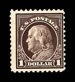 188 og 518b image#518b, $1.00 Deep brown, fresh mint example of this rare and often misidentified shade, possessing especially true deep brown color (actually the shade identification in Scott is a misnomer, as examples of this stamp must display hues of yellow throughout the design in order to be correctly identified as #518b), o.g., only a faint trace of hinging, fine; nearly all existing examples of this shade are poorly centered and a terribly difficult stamp to find regardless of centering; 1984 PF certificate. (Image) $1,800.00