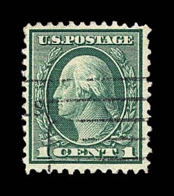 192 O 544 image#544, 1c Green coil waste, perf. 11, an impressive appearing used example of this extremely scarce and difficult stamp, possessing wonderful centering within totally uncharacteristically large margins, features hardly ever found on this issue, exceptionally bright and attractive color and showing a detailed sharp impression, plus neat portion of desirable machine cancel, small edge crease at left apparent in watermark fluid only and not detracting from this stamps gorgeous and highly unusual extremely fine appearance; probably no more than 100 used copies exist and priced by Scott in the grade of only fine because the vast majority are poorly centered, particularly desirable with this exceptional visage despite the small flaw; clear 1957 PF certificate for a pair, this being the right stamp. (Image) $3,250.00