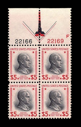 196 nhPB 803-34 image#803-34, 1/2c-$5.00 Presidentials cplt. in plate number blocks of four, unusually fresh and generally selected for their extraordinary centering, o.g., n.h., very fine-extremely fine. (Image) $690.60