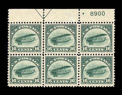 197 ogPB C2 image#C2, 16c Green, full top margin arrow and plate no. 8900 block of six, exceptionally well centered, fresh color, o.g., very lightly hinged in one stamp only, rather strong natural flat plate gum bend, very fine and choice. (Image) $1,000.00