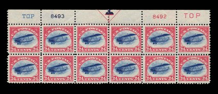 198 ogPB C3 image#C3, 24c Carmine rose and blue, top margin arrow, two "TOP" and plate nos. 8493, 8492 block of twelve, bright fresh colors, o.g., lightly hinged in the selvage only, all stamps are n.h., natural gum bends and wrinkles as often found, fine-very fine. (Image) $1,225.00
