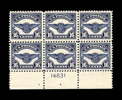 199 nhPB C5 image#C5, 16c Dark blue, full bottom margin plate no. 14831 block of six, deep luxuriant color on bright paper, o.g., n.h., natural flat plate gum bends, fresh and overall very fine. (Image) $2,350.00