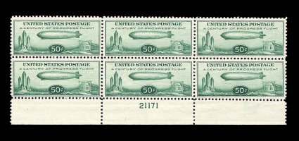 200 nhPB C18 image#C18, 50c Graf Zeppelin, full bottom margin plate no. 21172 block of six, particularly fresh, well centered, o.g., n.h., couple of small natural gum creases in right pair, very fine. (Image) $725.00
