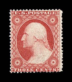 22 nh 26 image#26, 3c Dull red, Ty. II, exceptionally well centered for this tightly spaced issue, brilliantly fresh and bright, strong color and impression, pristine o.g. that is never hinged, choice very fine; photocopy of a 1991 PF certificate for a block of four, this being the bottom right stamp. (Image) for hinged $75.00